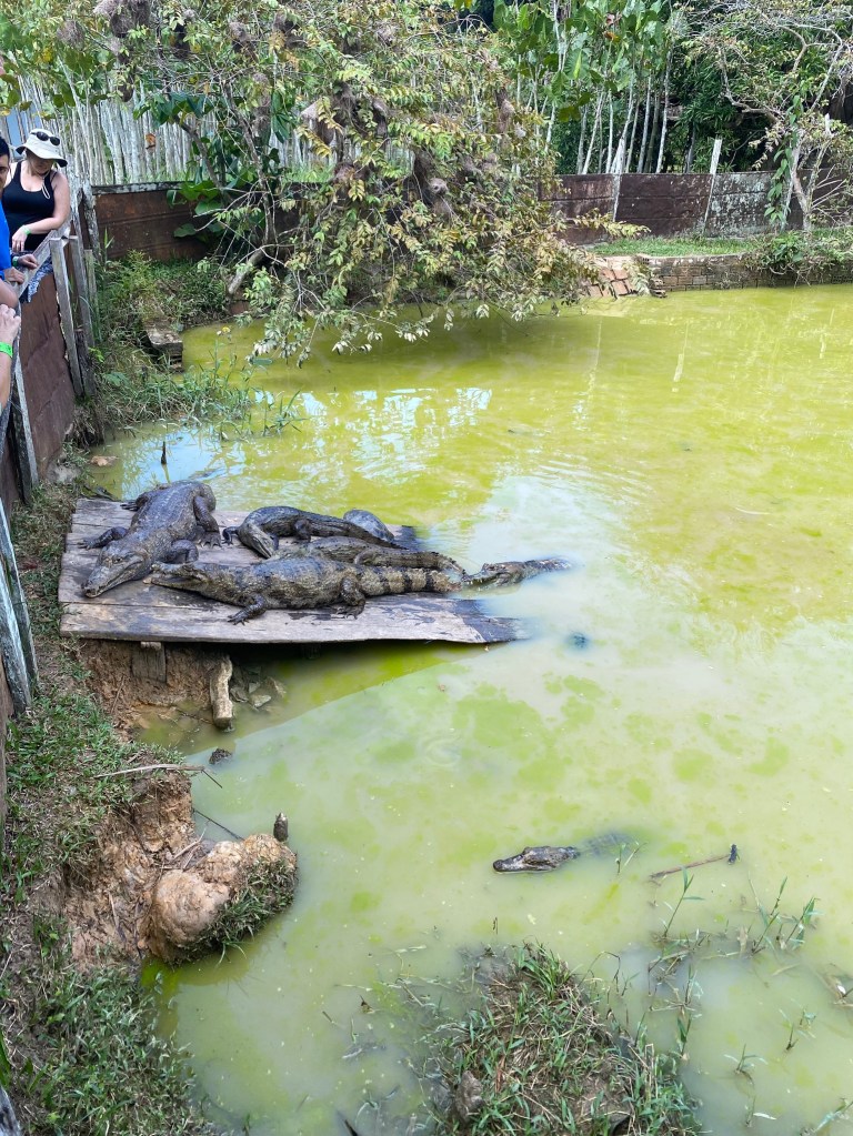 Before heading to the lodge. The trip by small boat took about two hours total travel time to reach our lodging. We stopped along the way at Fundo Pedrito a small animal farm where we got to see alligators and Paiches. Paiches are large fish that are native to the Amazon River.